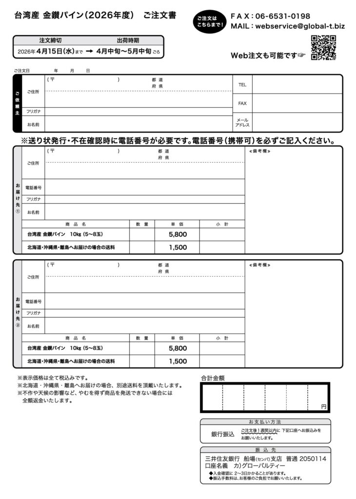 2025年度 台湾産 ゴールドダイヤパイン 芯までとろける極上の甘み♡台湾産 金鑽パイン(台農17号)販売開始!🍍太陽の光をたっぷり浴びて育った、台湾の高級パイナップル「金鑽パイン」。一口食べれば広がる、濃厚な甘さと爽やかな香り。なんと、芯までやわらかく食べられるのが特長!無駄なく、まるごと美味しく味わえます。ビタミンCや酵素がたっぷりで、美容や健康にも嬉しいフルーツ。毎日のご褒美に、友人、家族等への贈り物に、いかがでしょうか?数量限定での販売です。この機会に、台湾の味わいをご自宅でぜひご堪能ください🌴QRからでも注文できますので、QRをスキャンして下さい〜!#台湾産金鑽鳳梨 #芯までLOVE #台湾パイン #食べるエステ
